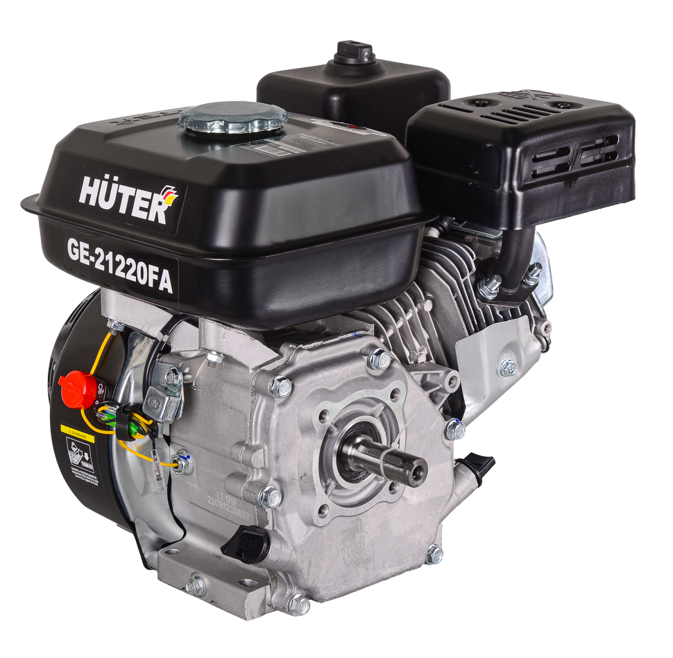 Четырехтактный одноцилиндровый двигатель HUTER GE-21220FА используется для работы мотоблоков, снегоуборочных машин, измельчителей и другой садовой и сельскохозяйственной техники.