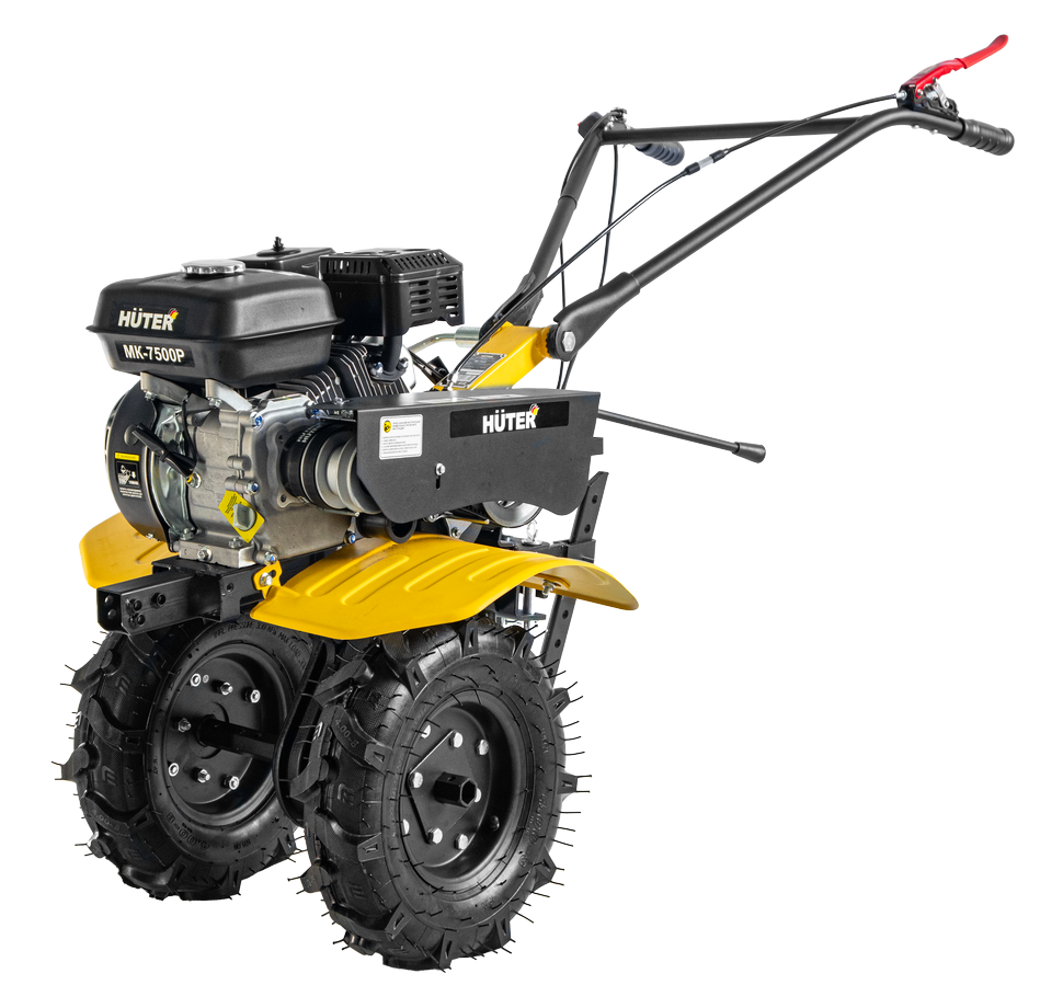 Сельскохозяйственная машина HUTER MK-7500Р имеет ременной привод активной навески. Мотоблок имеет 3 передачи: 2 вперёд и 1 назад. Ширина обработки почвы зависит от размеров лезвий и в базовой комплектации составляет 100 см. Если необходимо, возможна обработка узких полос земли. Для этого нужно отсоединить составные части фрез. Диаметр фрез - 30 см., регулировать глубину обработки можно с помощью сошника.