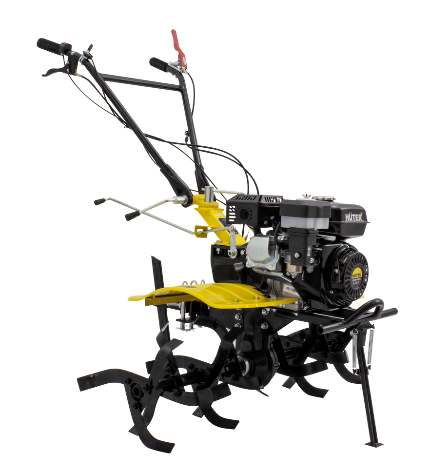 Двигатель имеет блокирующий датчик аварийного уровня масла в картере. Поршневая группа ДВС с хромовым покрытием. Эффективный маслонаполненный воздушный фильтр карбюратора. Система автоматической регулировки оборотов двигателя, в зависимости от нагрузки на навесное оборудование. Для защиты оператора на HUTER MK-8000PВ установлены широкие крылья, исключающие выброс из-под фрез посторонних предметов и грязи.